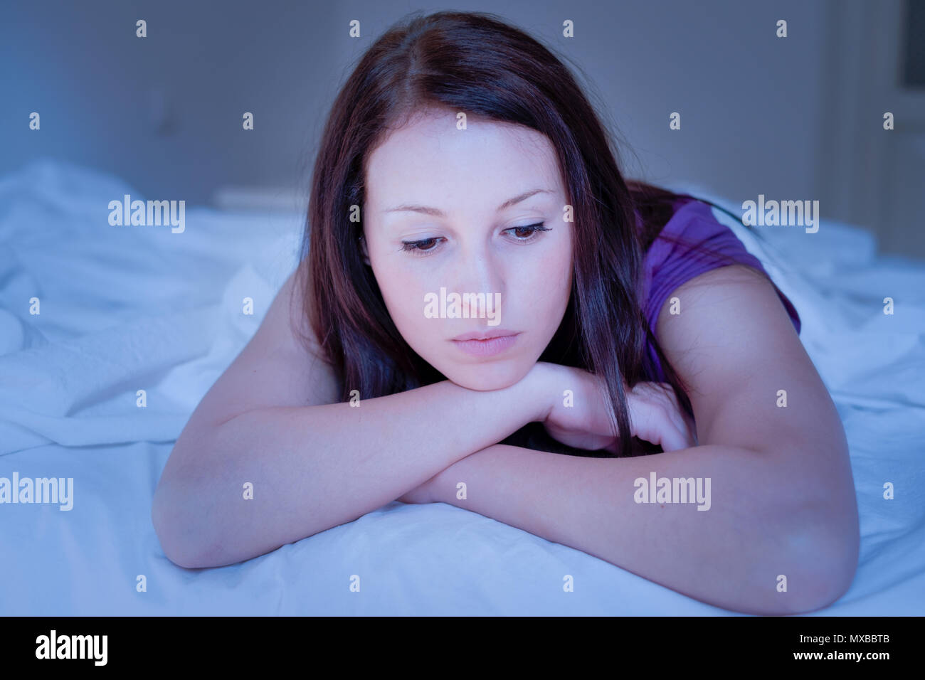 Triste E Sola Donna Giaceva Nel Letto A Notte Foto Stock Alamy