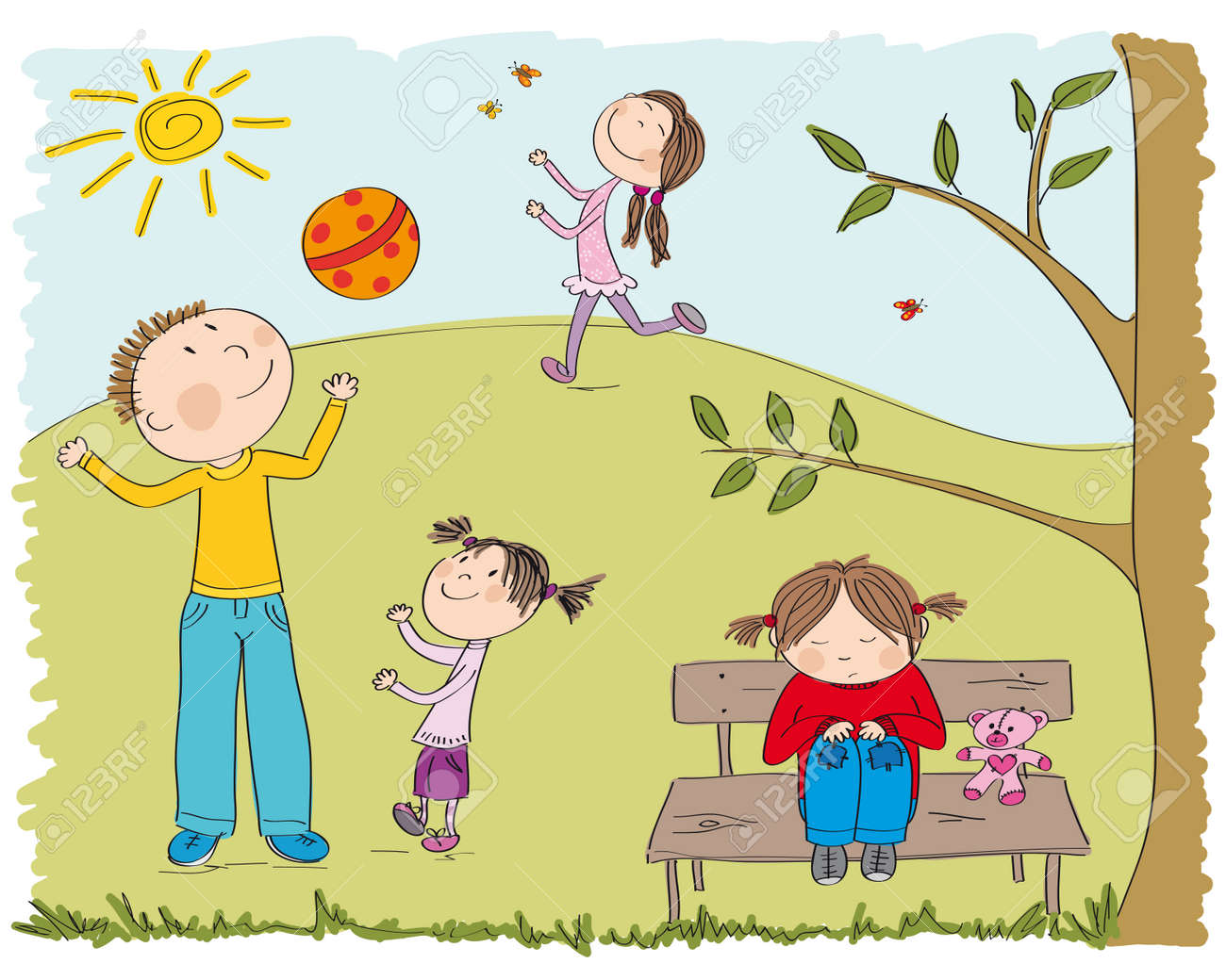 Vettoriale I Bambini Felici Che Giocano Fuori Nel Parco Una Ragazza E Triste E Sola Sedendosi Sul Banco Sotto L Illustrazione Disegnata A Mano Originale Dell Albero Image