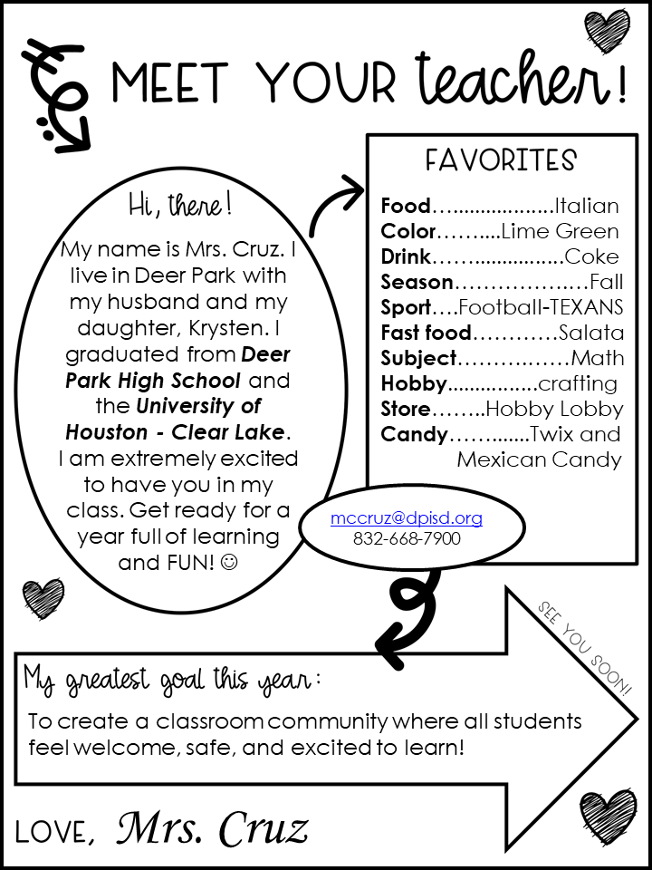 Office Phone Office Fax Office Hours 800 am 415 pm School Hours 915 am 330 pm. Meet Your Teacher Mrs Dolezal's Classroom Website Welcome first graders!. A huge part of Meet the Teacher is is introducing yourself to your students and their families This might come as part of an event where students meet you or need to be done virtually for safety reasons Having a bio lets students get to know you and what to expect These are typically one sheet with short background, fun information and a little about your class Top Meet the Teacher Gift Ideas!.