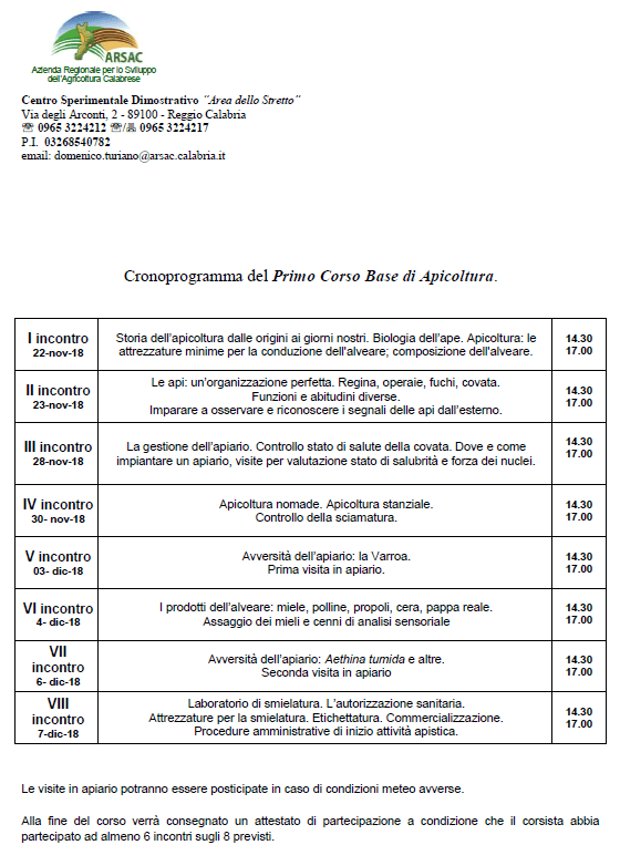 Programma Del Iº Corso Base Di Formazione In Apicoltura Presso Il Centro Sperimentale Dimostrativo Di Reggio Calabria Azienda Regionale Per Lo Sviluppo Dell Agricoltura Calabrese
