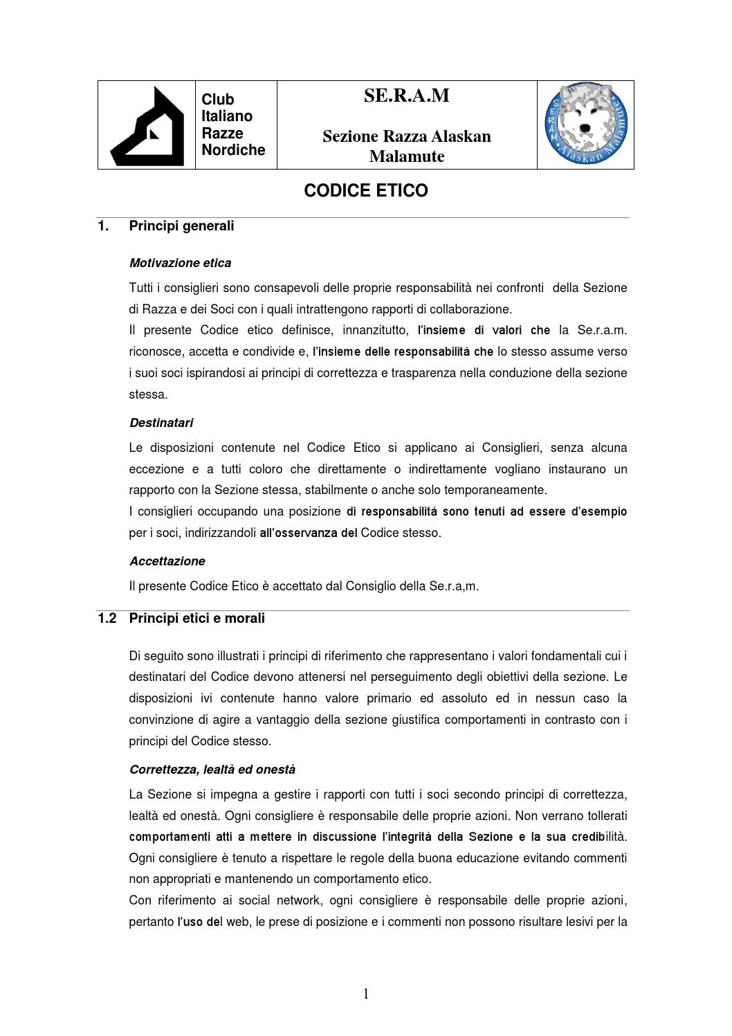 5 Struttura del Codice Etico Il presente Codice Etico è composto da quattro sezioni –la prima sezione “Principi etici generali”esplicita i valori e i principi cui devono attenersi i destinatari del Codice Etico;. Codice Etico è un documento con cui la Banca enuncia sia l’insieme dei diritti, dei doveri e delle responsabilità della Società rispetto a tutti i cd stakeholder , sia “standard” etici di riferimento e. Traduzioni in contesto per "codice etico" in italianoinglese da Reverso Context Il Nuovo Testamento è un buon codice etico, suggeritomi da poeti e filosofi molto più intelligenti di me.