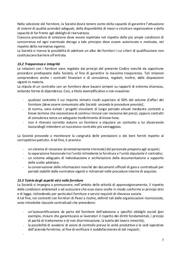 La seconda sezione –“Codice di Comportamento”, evidenzia i criteri di condotta e le modalità di. Nell'articolo di Green Marketing, ho provato a introdurre sia il concetto che l'esempio di codice etico per siti verdi come DMLRORG!. Gefran conduce la propria attività, interna ed esterna, rispettando in modo imprescindibile le leggi vigenti, le regole del mercato ed osservando i principi contenuti nel Codice Etico Gefran, inoltre, si dichiara libera di non intraprendere o proseguire alcun rapporto con chiunque dimostri di non rispettarne il contenuto e lo spirito e/o ne violi i principi e le regole di condotta.