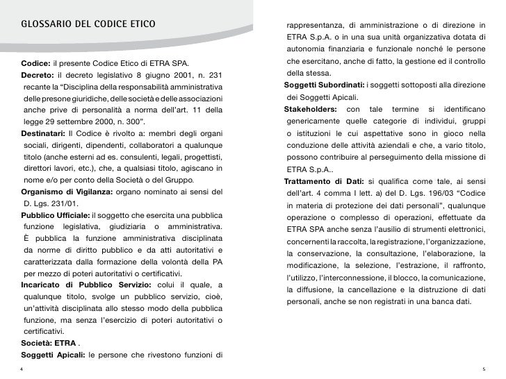 FILE NOME PZOVICET001A_CODICE ETICODOCX Nota il presente documento è di proprietà dell’Impresa Pizzarotti & C SpA, che ne vieta la riproduzione (L 2441 – 633 e smi) Per i suoi contenuti progettuali il Modello ex DLgs 231/01 è soggetto a diritti di proprietà intellettuale della Future Works Srl CODICE ETICO. Il Codice etico è uno strumento utile a preservare il valore e l’integrità dell’azienda nel tempo È un insieme di principi positivi e di regole di di immagine, per esempio, ma soprattutto di reputazione e di credibilità, che possono avere risvolti tali da mettere in pericolo la fiducia da parte dei mercati e la fiducia degli. Allegato 7 CODICE ETICO 26 4 1 INTRODUZIONE L'Internal Auditing è una funzione di controllo indipendente preposta alla verifica dell'adeguatezza dei sistemi di controllo aziendali Svolge un controllo di terzo livello presidiando i controlli di secondo livello svolti dalle altre funzioni.