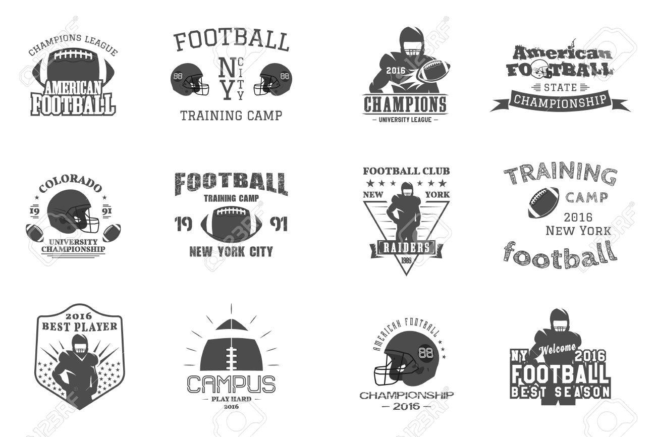 Vettoriale Universita Di Rugby E La Squadra Di Football Americano Campus Badge Universitari Loghi Etichette Insegne In Stile Retro Vintage Design Grafico Per T Shirt Web Monocromatico Stampa Isolato Su Uno Sfondo