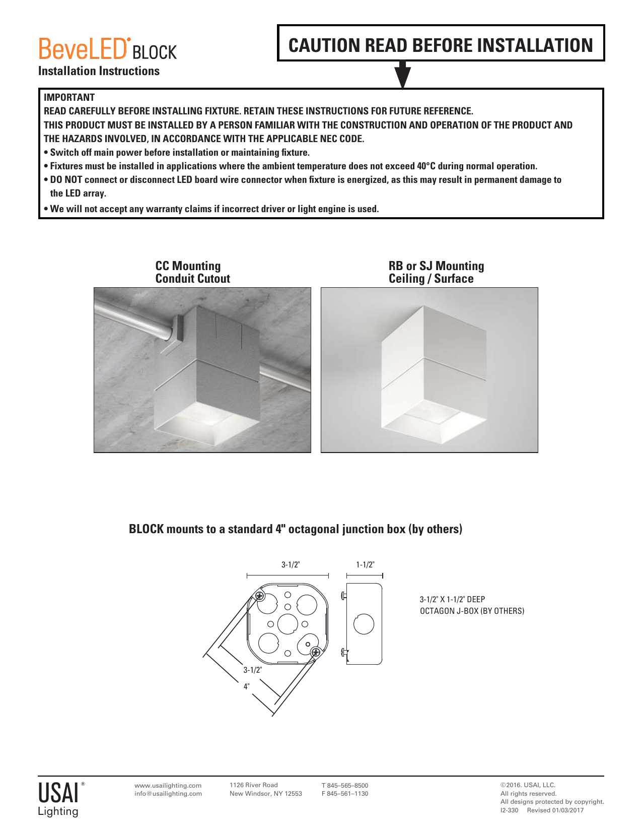 USAI Lighting USAI Lighting is an industry leader in manufacturing sophisticated LED fixtures and those that utilize a variety of sources. USAI Lighting’s 5inby5in square BeveLed Block completely encloses surfacemounted junction boxes in concrete ceilings It emits white light in color temperatures from 2,0K to 6,000K and produces 25 to 90degree beam spreads It is designed for ceilings with recessed or exposed conduits and is available in white, black, grey, bronze and custom colors. 1126 River Rd New Windsor, NY P (845) F (845) info@usailightingcom.