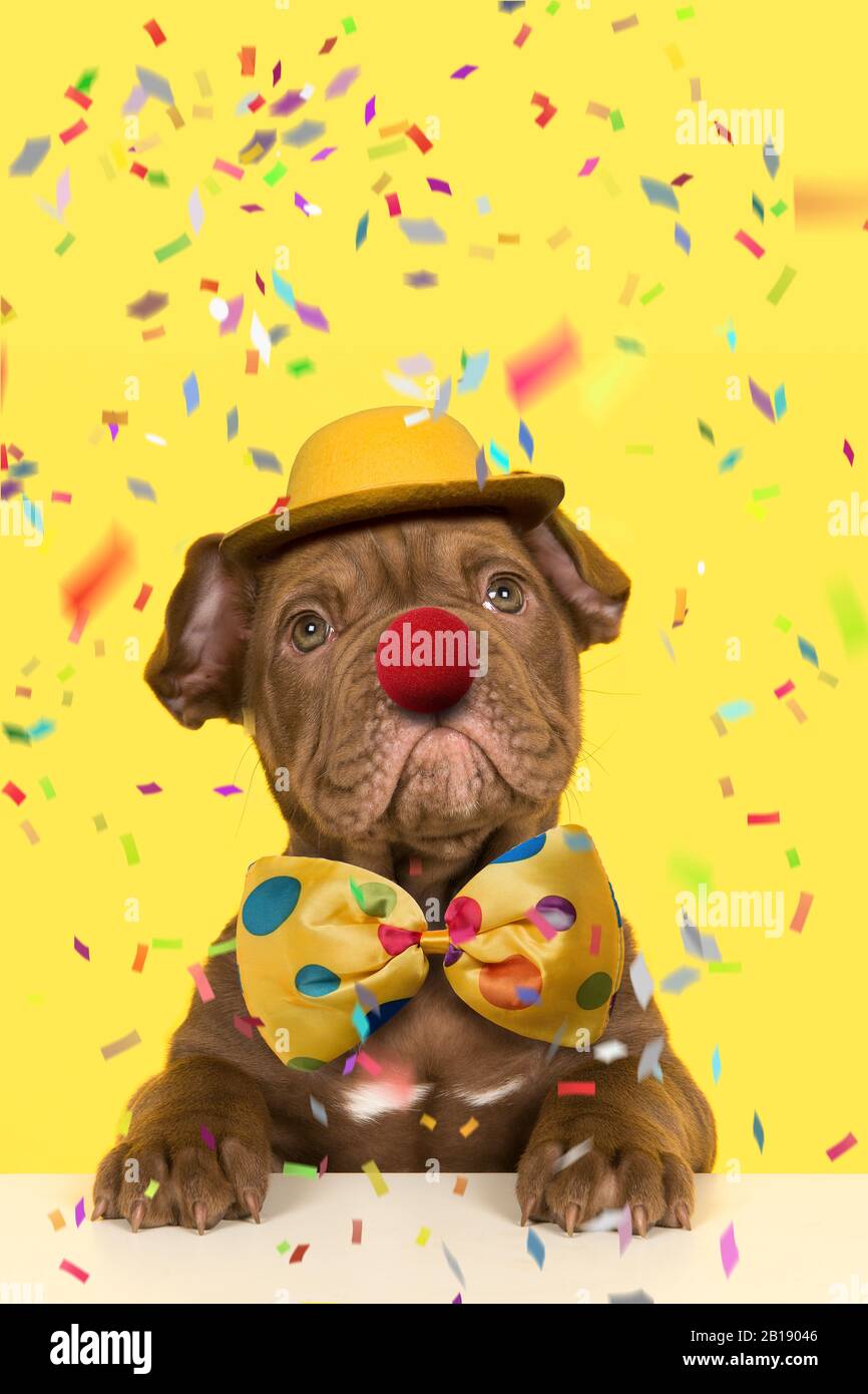Carino Vecchio Cornetto Inglese Dressep Cucciolo Come Un Clown Con Prua Cappello E Un Naso Rosso Su Uno Sfondo Giallo Con Confetti Foto Stock Alamy