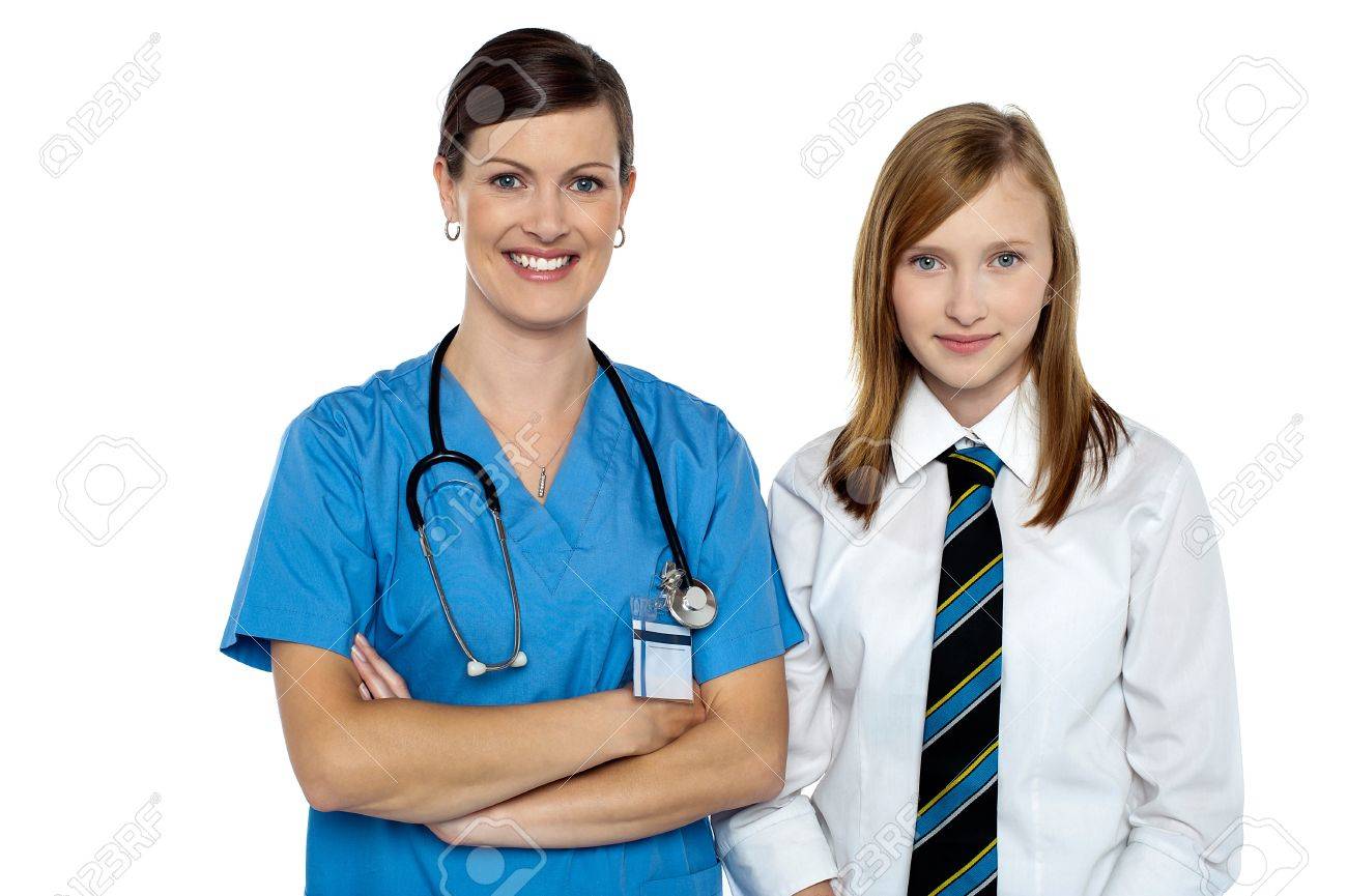 Confident Medical Expert Posing With Young School Girl Dressed Stock Photo Picture And Royalty Free Image Image
