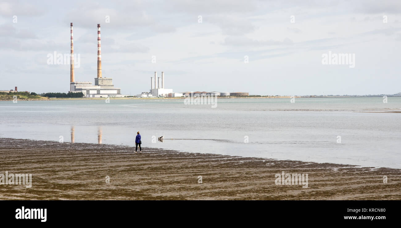 Una Persona E Il Loro Cane A Camminare Lungo Il Sandymount Strand Spiaggia Sulla Baia Di Dublino Con Il Punto Di Riferimento Twin Camini Di Poolbeg Power Station In Aumento In La