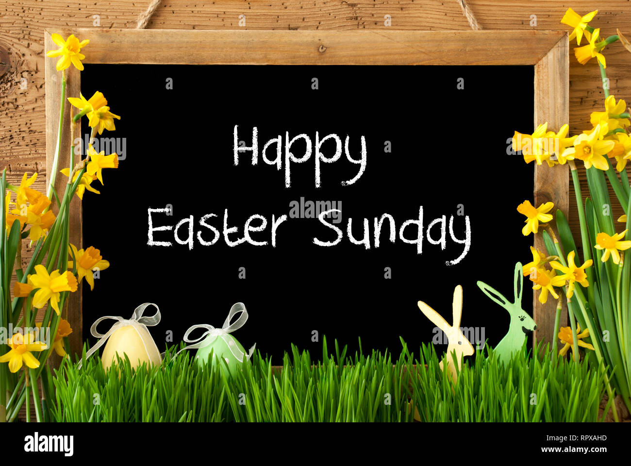 Lavagna Con Testo In Inglese Buona Pasqua Domenica Fiori Di Primavera Nacissus O Daffodil Con Erba Uovo Di Pasqua E Bunny Rustico In Legno Invecchiato Sfondo Foto Stock Alamy