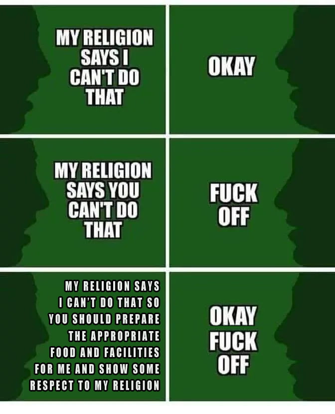 I Can T Do That Because Of My Religion Ok You Can T Do That Because Of My Religion Not Ok Simple Isn T It Meme On Me Me