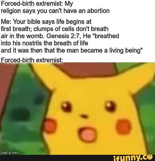 Forced Birth Extremist My Religion Says You Can T Have An Abortion Me Your Bible Says Life Begins At first Breath Clumps Of Cells Don T Breath Air In Ihe Womb Genesis 2 7 He Breathed