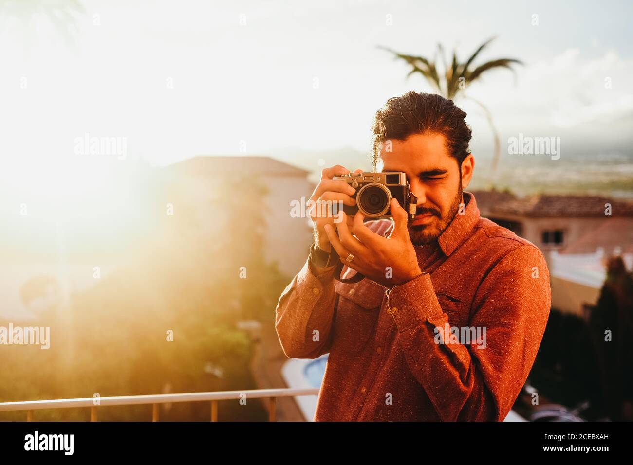 Uomo Con La Bearded Adulto Che Scatta Una Foto Con La Fotocamera In Piedi Balcone In Oro Luminoso Retroilluminato Foto Stock Alamy
