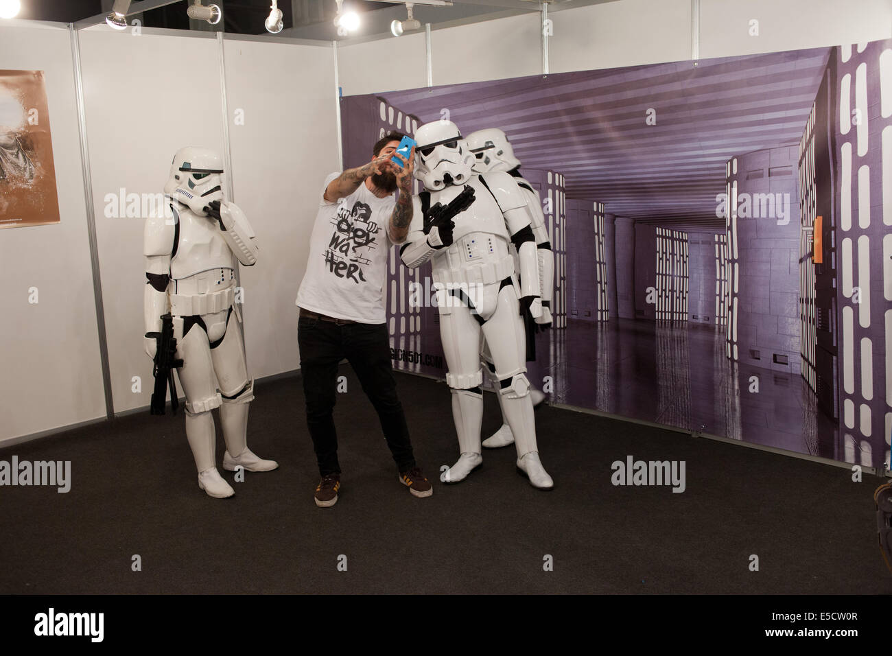 Uomo Che Scatta Una Foto Con Star Wars Stormtroopers Alla Fiera Comic Internazionale Di Barcellona Il 17 Maggio 14 A Barcellona Catalogna Spagna Foto Stock Alamy