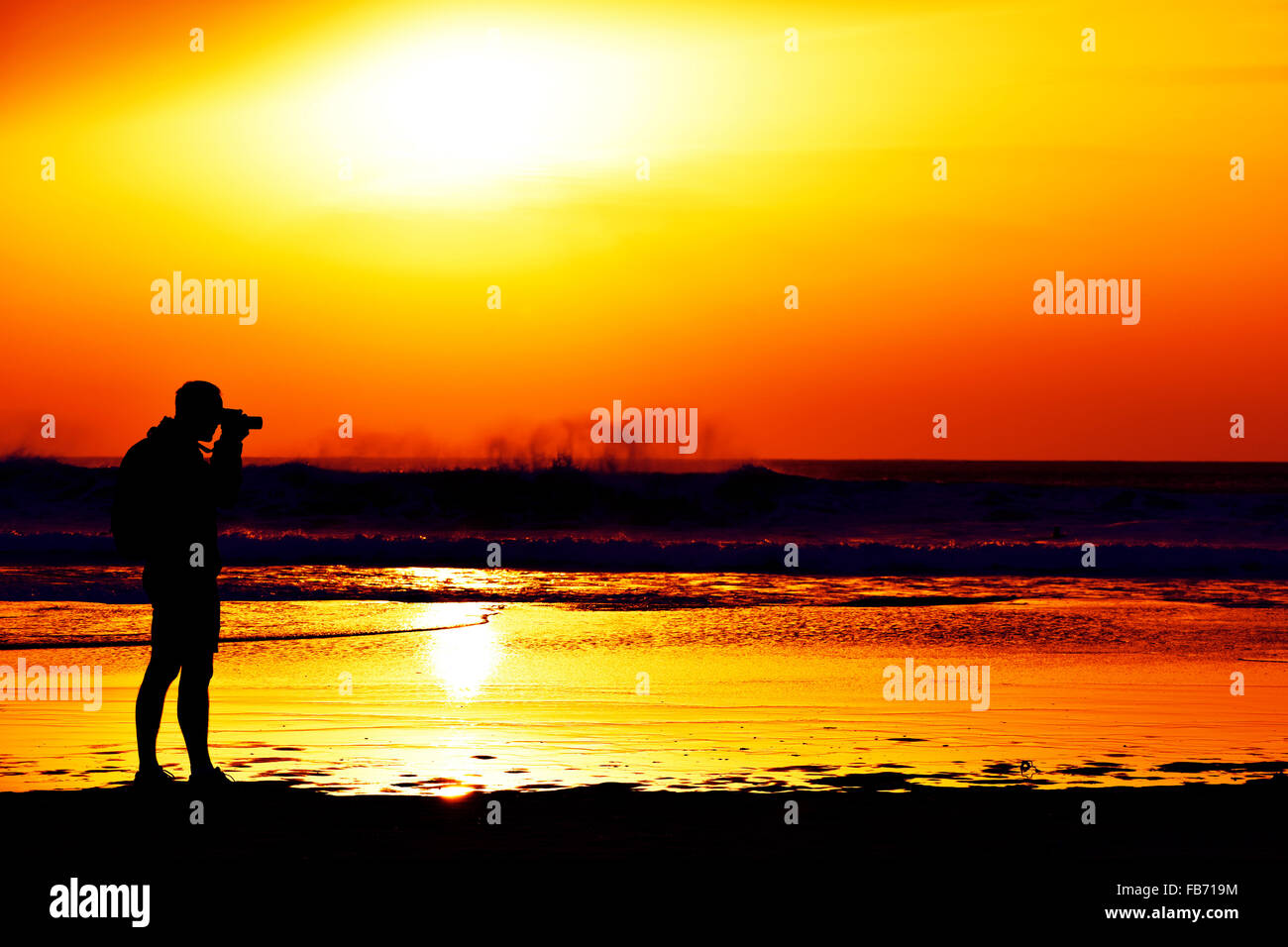 La Silhouette Di Un Giovane Uomo Caucasico Di Scattare Una Foto Di Fronte Al Mare Al Tramonto Contro Un Colorato Orange Sky Foto Stock Alamy