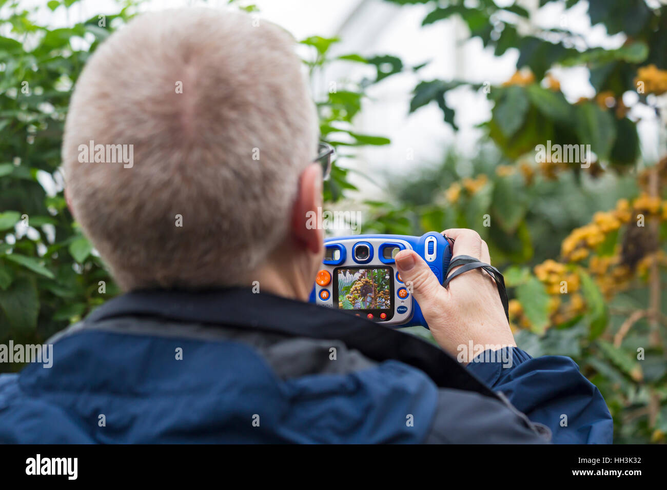 Uomo Che Scatta Una Foto Di Farfalla Morfo Blu Utilizzando La Fotocamera Vtech In Glasshouse Rhs Garden Wisley Surrey Inghilterra Regno Unito Nel Mese Di Gennaio Foto Stock Alamy
