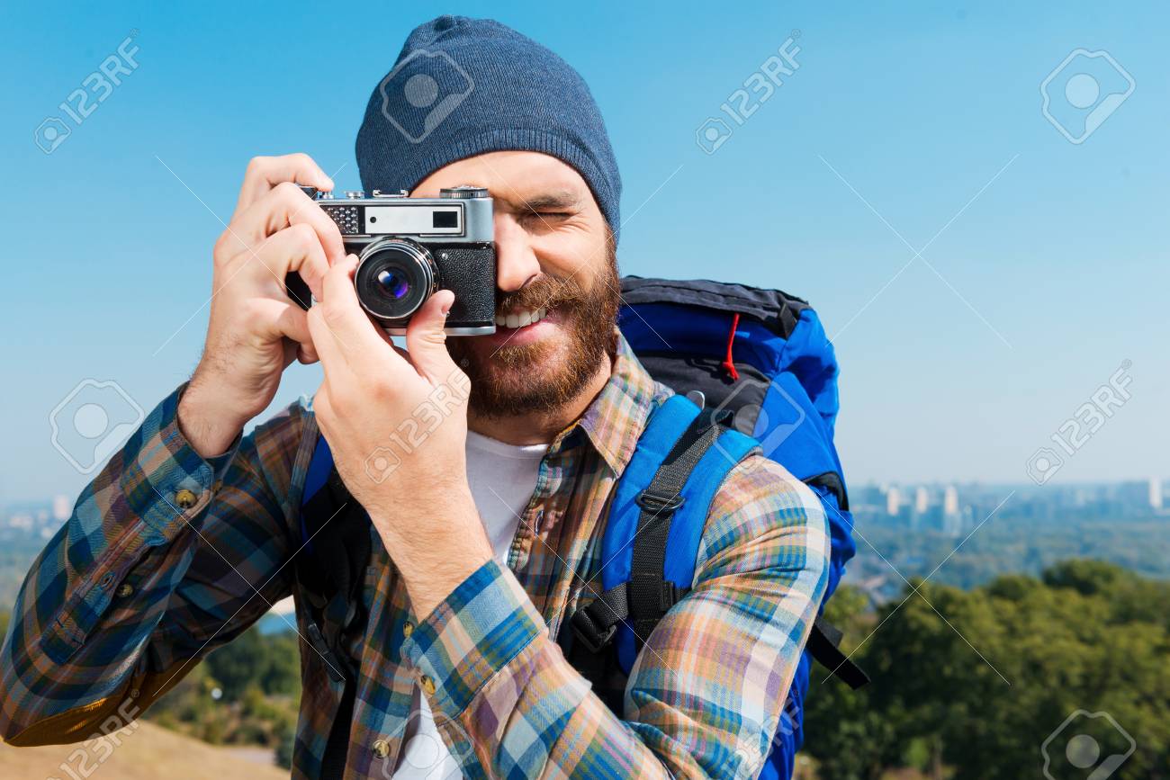 Immagini Stock Non Puo Mancare Ad Uno Splendido Scenario Handsome Giovane Uomo Che Trasportano Zaino E Scattare Una Foto Di Una Vista Image