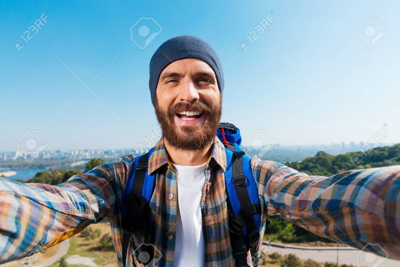 Immagini Stock Io Sono Nel Posto Piu Bello Handsome Giovane Uomo Che Trasportano Zaino E Di Scattare Una Foto Di Se Stesso Image