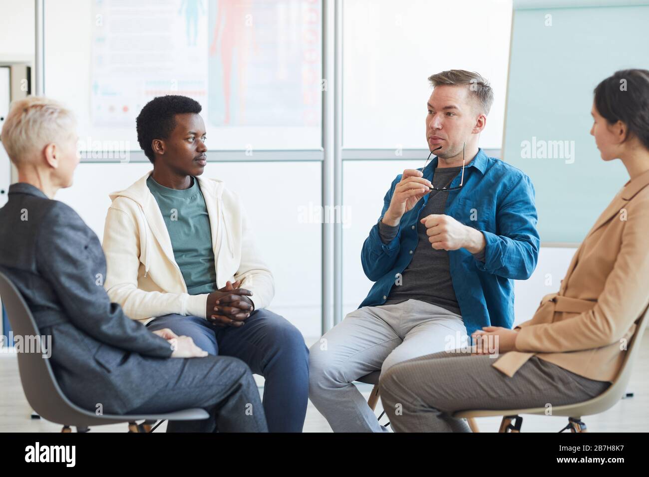 Gruppo Multietnico Di Persone Sedute Su Sedie In Gruppo Di Sostegno E Condividendo Storie Con Lo Psicologo Foto Stock Alamy