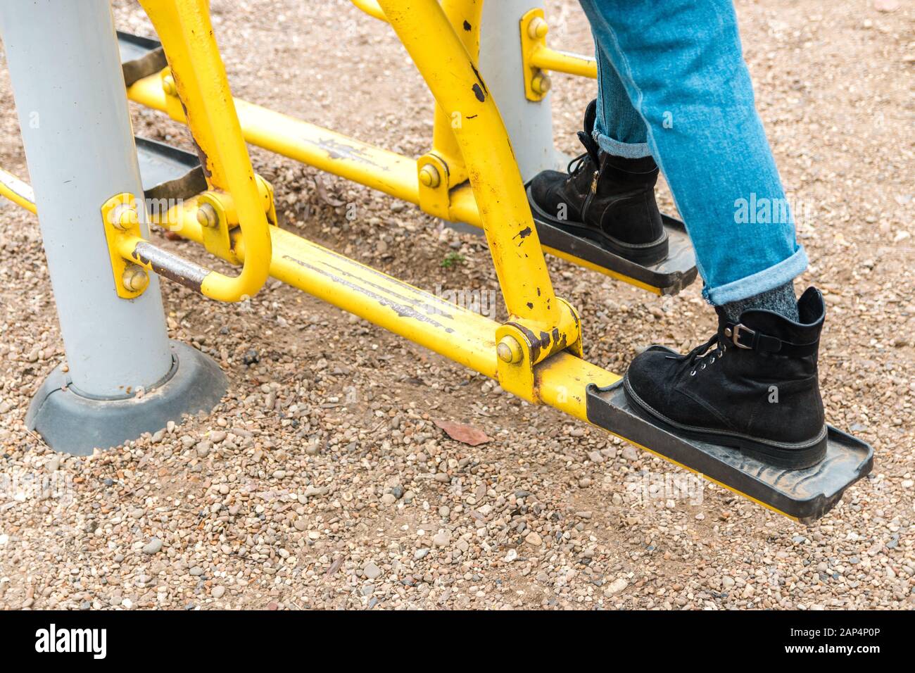 Primo Piano Gambe Di Una Donna In Scarpe Casual E Jeans Sulla Palestra All Aperto Macchina Da Allenamento Foto Stock Alamy