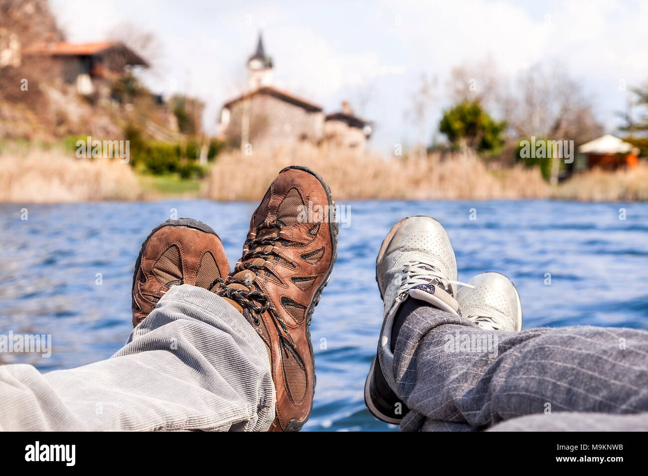 Primo Piano Dei Piedi In Scarpe Da Trekking Di Fronte A Un Paesaggio Di Un Lago Di Montagna Foto Stock Alamy