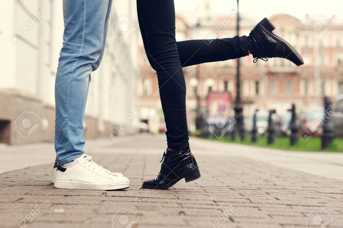Primo Piano Di Gambe Di Coppia Baciare Alla Strada Della Citta Con Pavimentazione In Pietra Uomo