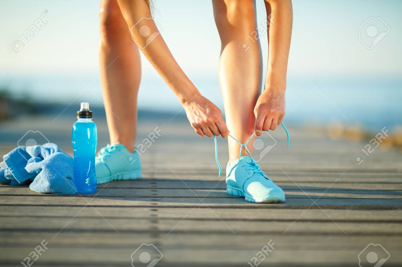 Immagini Stock Scarpe Da Corsa Donna Legare Lacci Per Le Scarpe Primo Piano Della Femmina Idoneita Sportiva Corridore Si Prepara Per Fare Jogging All Aperto Sul Lungomare In Estate Image