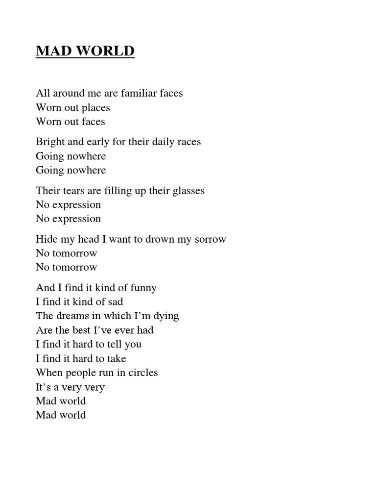 "Mad World" To play like Tears for Fears, play the following capoed on the second fret To play like Gary Jules does on piano, play the following capoed on the first fret Verses Em G D A Chorus Em A Verse 1 All around me are familiar faces Worn out places Worn out faces Bright and early for their daily races. Traduzione Mad World Testo di Mad World;. Mad Traduzione del vocabolo e dei suoi composti, e discussioni del forum It's mad to think that in two days' time, we'll be on the other side of the world!.