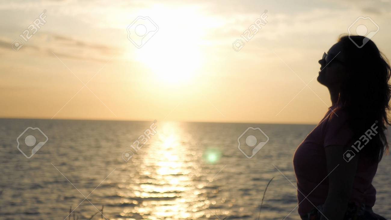 Une Jeune Fille Admire Le Beau Coucher De Soleil Au Bord De La Mer Un Leger Vent Souffle Banque D Images Et Photos Libres De Droits Image