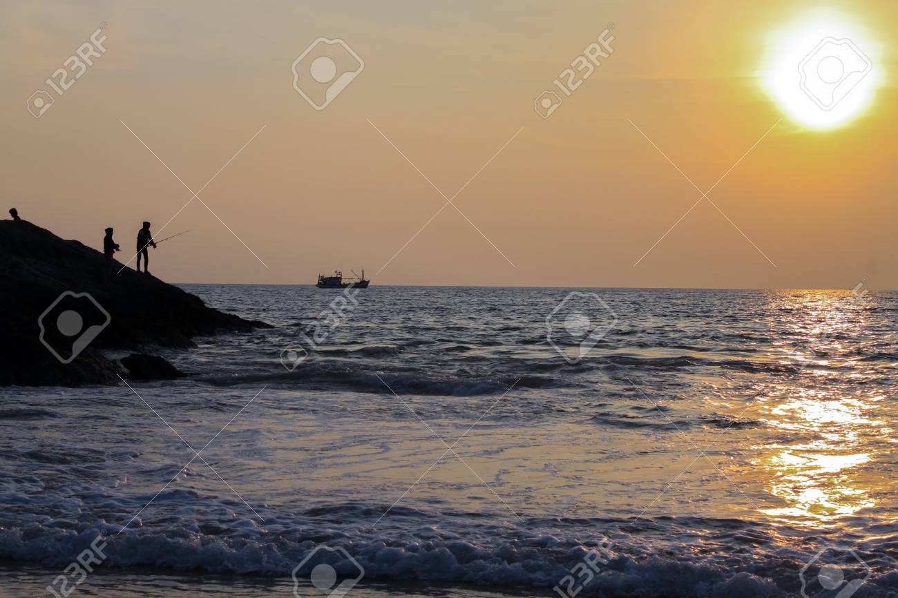 Une Silhouette D Un Pecheur Au Coucher Du Soleil Sur Un Bord De Mer Coucher De Soleil Paysage De Mer Avec Pecheur Debout Sur Le Rocher Sud De La Thailande L Ile De Phuket