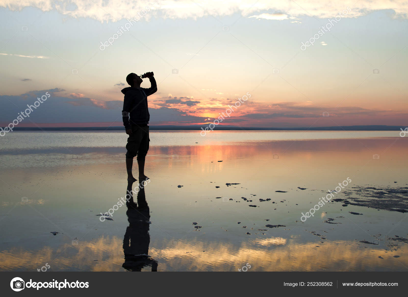 Homme Eau Potable Bouteille Bord Mer Pendant Coucher Soleil Photographie Nadirkeklik C