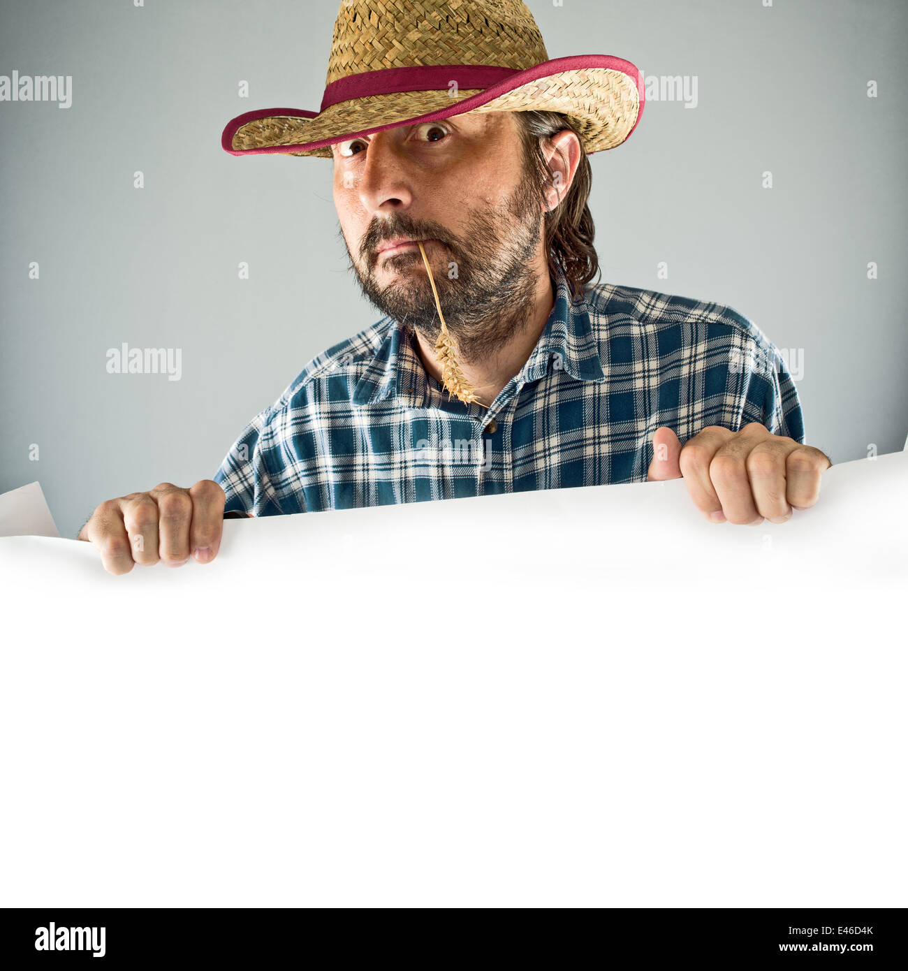 Contadino Con Cowboy Cappello Di Paglia Azienda Poster Vuoto Come Spazio Di Copia Foto Stock Alamy