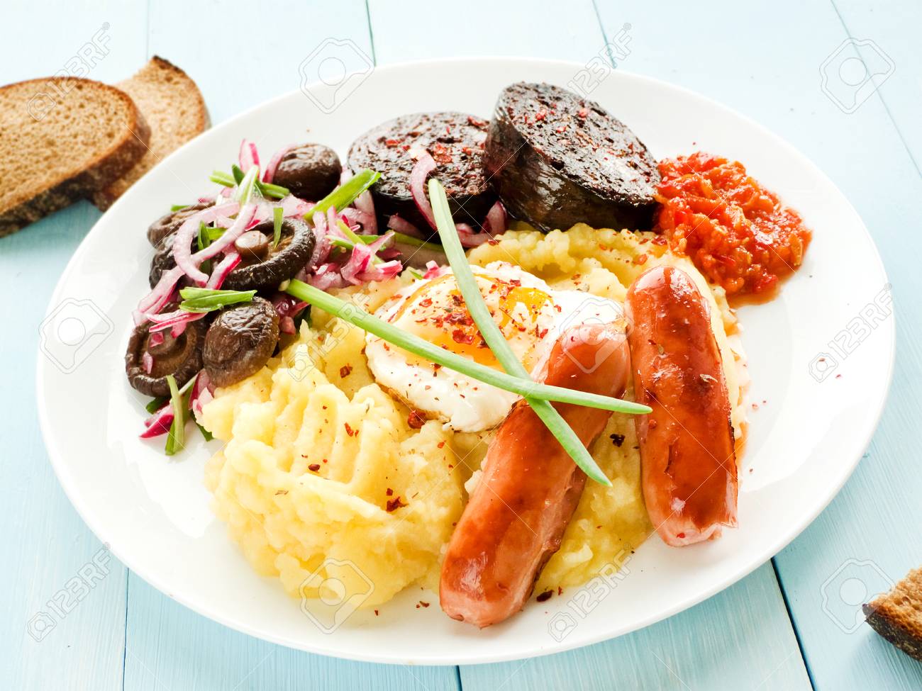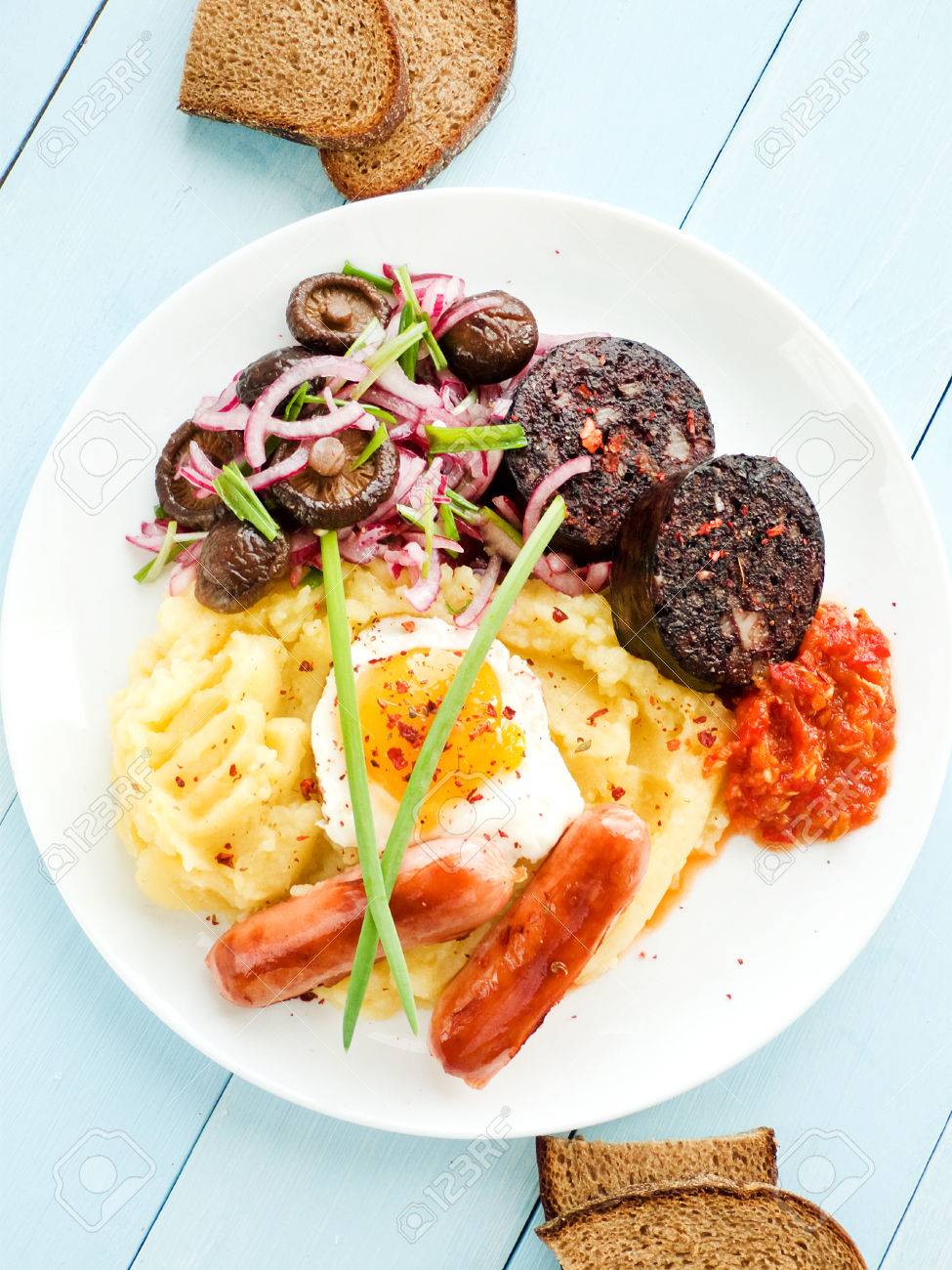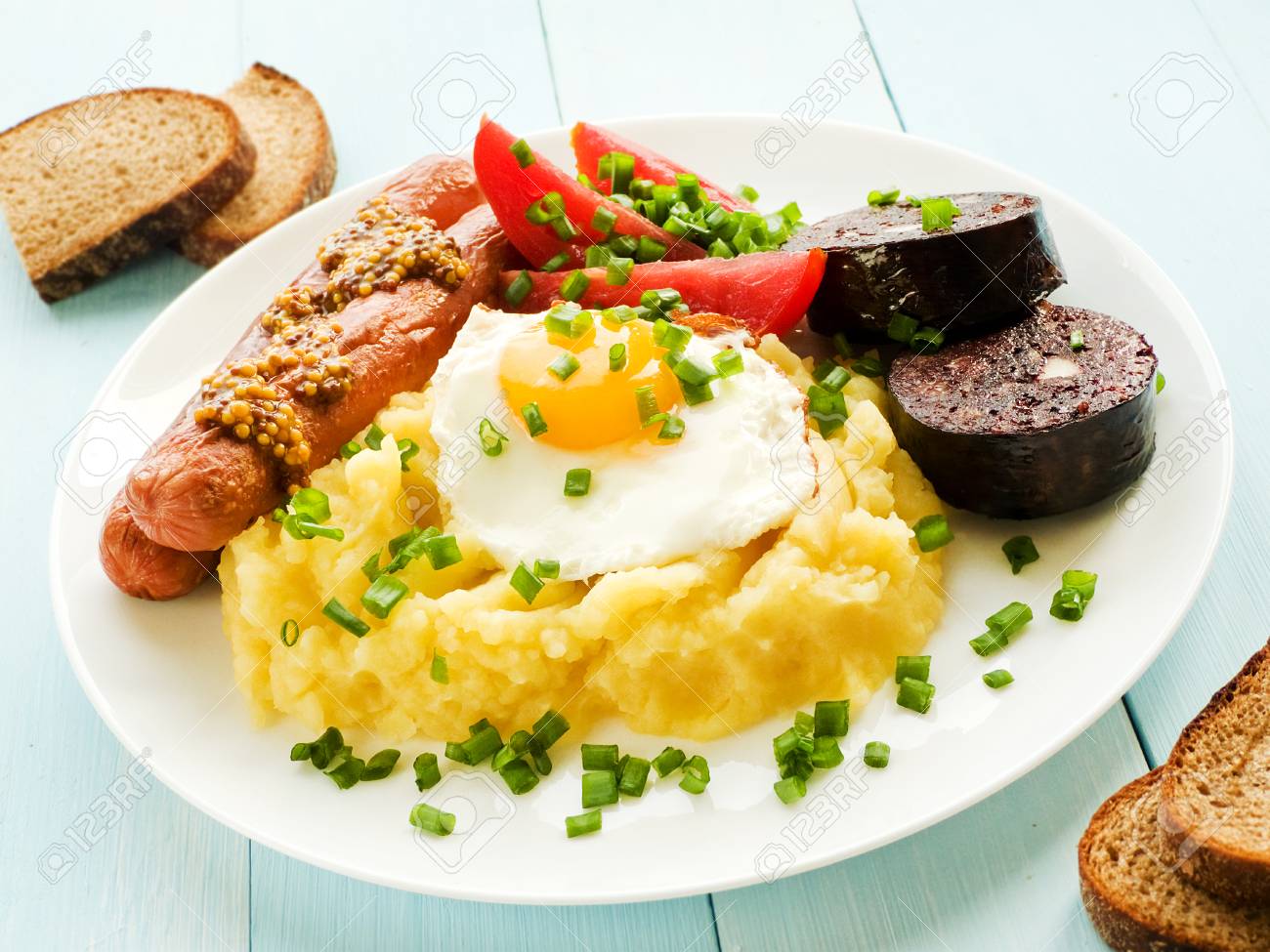 Immagini Stock Colazione All Inglese Pure Di Patate Salsicce Uovo Fritto E Budino Dof Poco Profondo Image