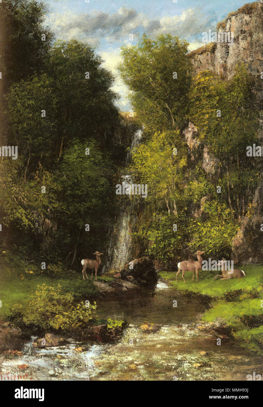 Inglese Una Famiglia Di Cervi In Un Paesaggio Con Una Cascata Francais Une Famille De Cerfs