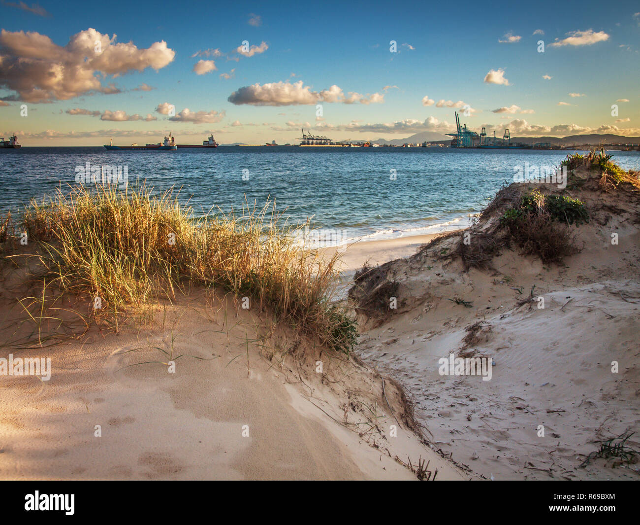 Beach And Sand Dune With Sea Grass And Clouds With The Port Of Algeciras In The Background Stock Photo Alamy