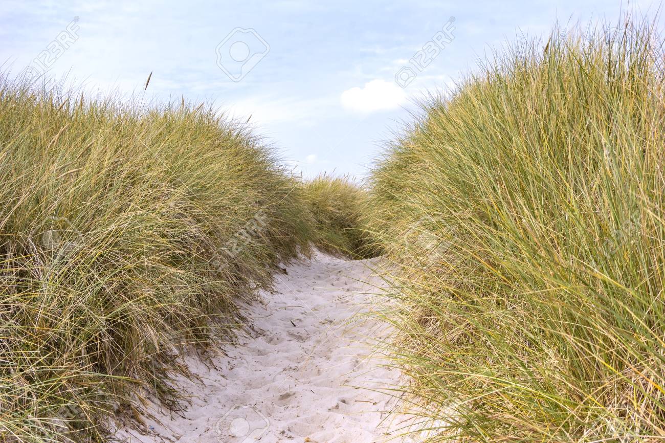 Green Marram Grass On Sand Dune At Beach Against Blue Sky On Sunny Day Wif Wilfried