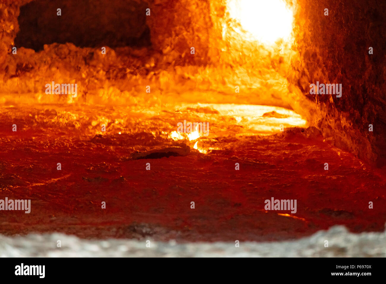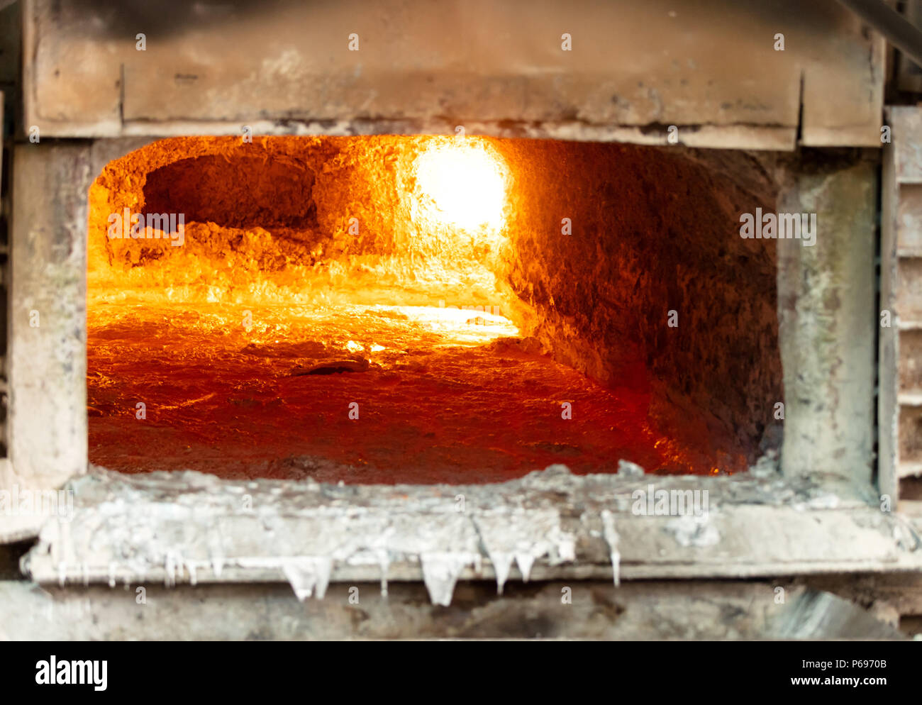 Guardare All Interno Di Un Alluminio Forno Di Fusione In Una Fonderia Con Il Metallo Liquido E Ossidare Lo Strato Di Scoria Su Di Esso Foto Stock Alamy
