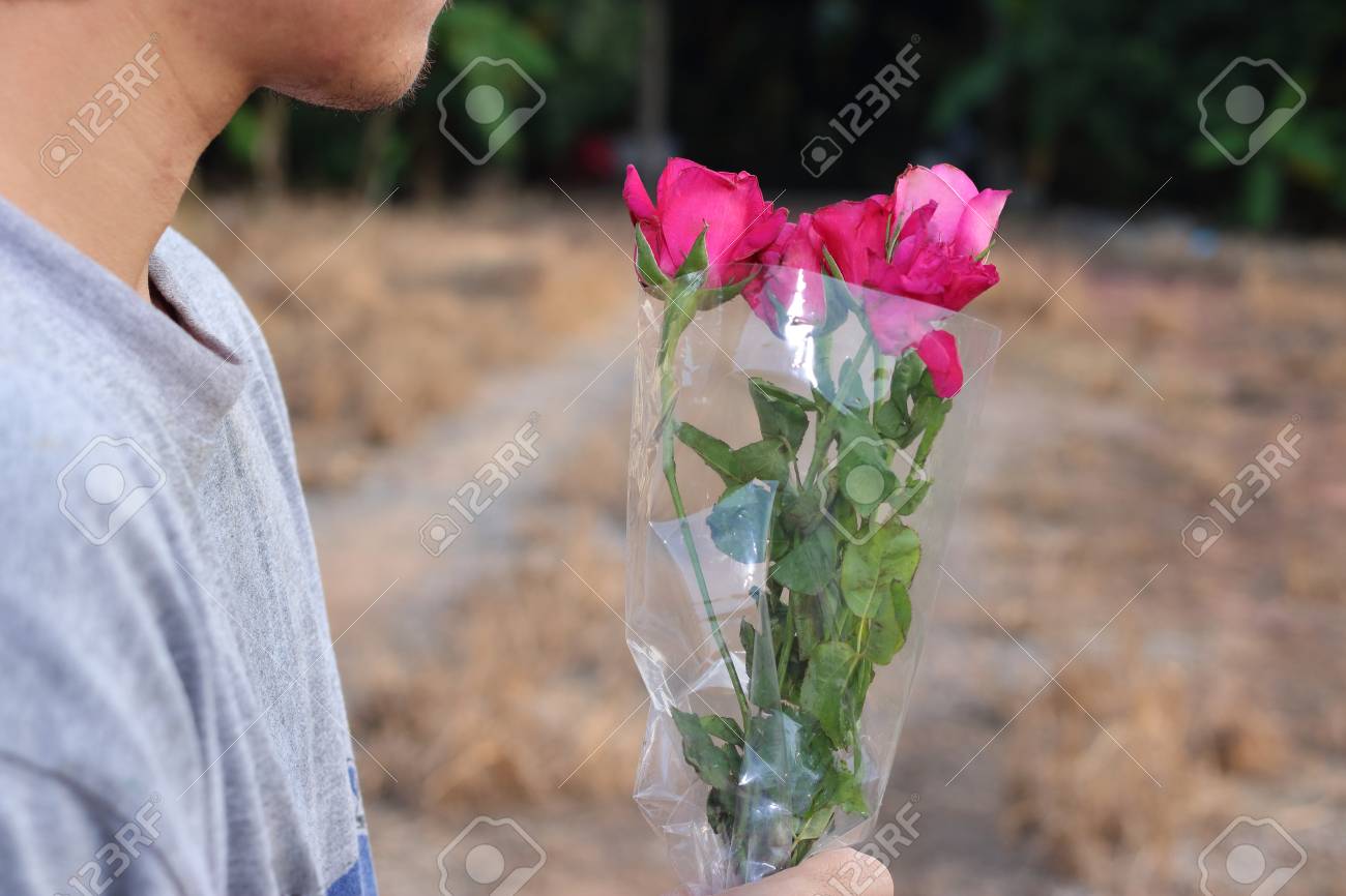 Immagini Stock Un Bel Mazzo Di Rose Rosse E Tenuto A Disposizione Del Giovane Uomo Rilassato Sulla Natura All Aperto Sfondo Amore E Romanticismo Concetto Di San Valentino Image