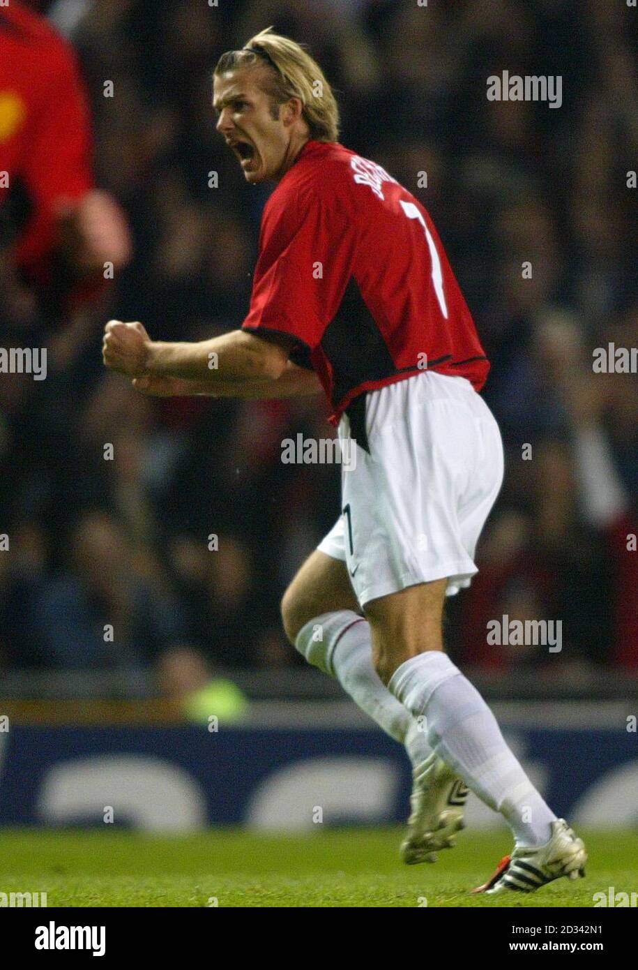 Manchester United S David Beckham Celebrates Scoring Against Real Madrid During Their Champions League Quarter Final 2nd Leg Match Against Real Madrid At Old Trafford Manchester This Picture Can Only Be Used Within