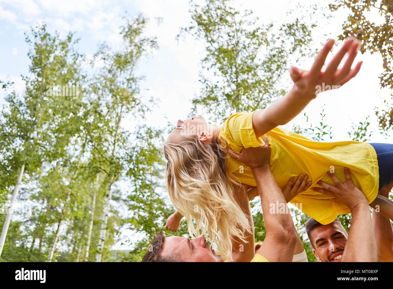 Giovani Levitare Una Donna In Aria Come Un Esercizio Di Team Building Foto Stock Alamy