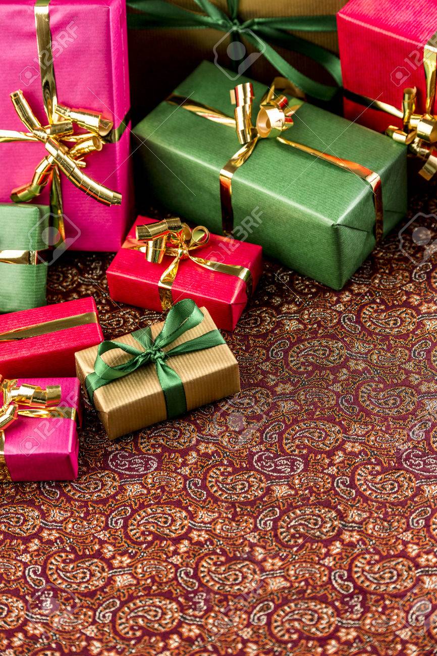 Immagini Stock Regali Avvolti In Tinta Unita Rosso Magenta Verde E Oro Strettamente Incorniciata Profondita Di Campo Composizione Diagonale Con Nulla In Primo Piano Ricco Di Texture Image