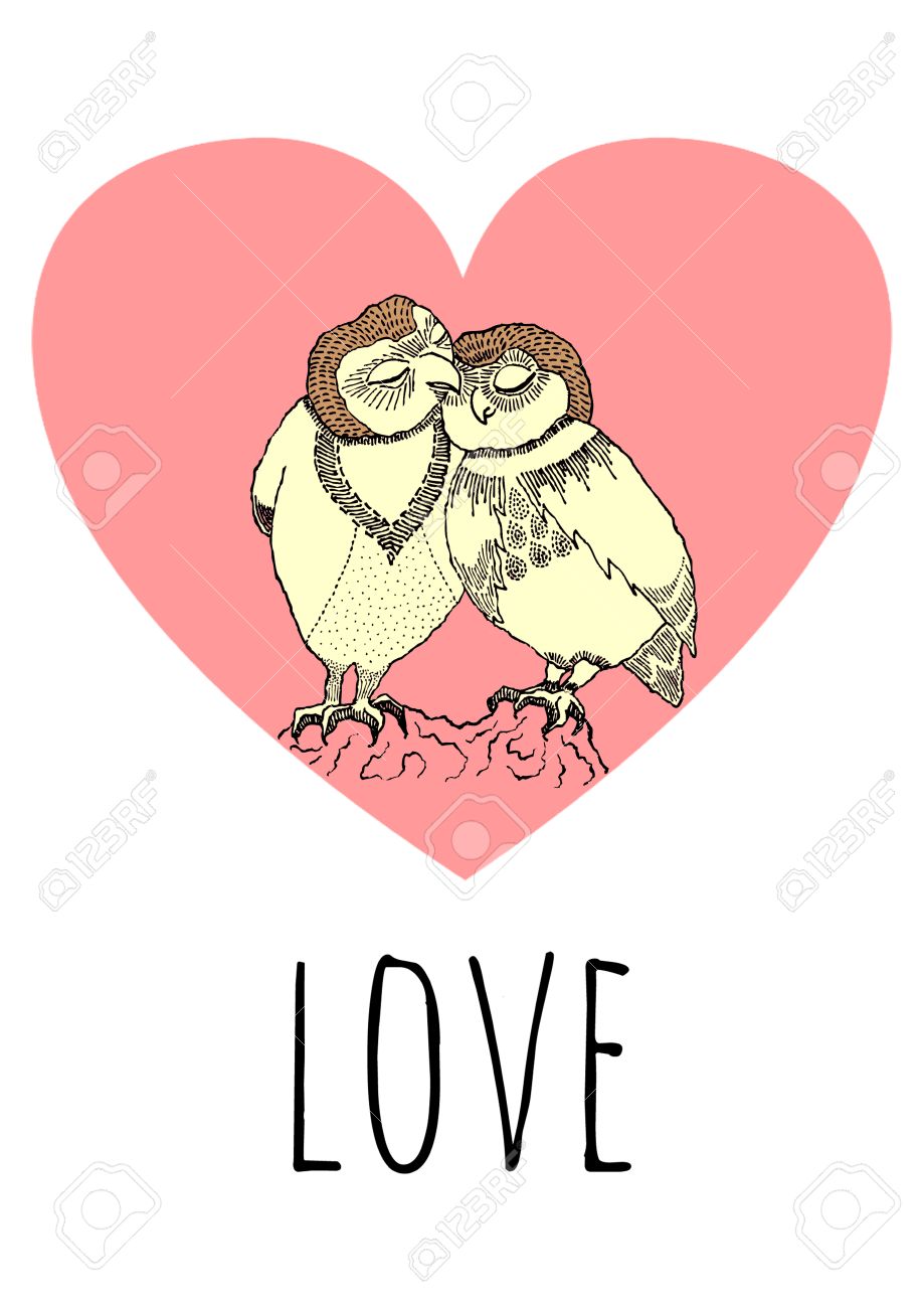 Two Owls In Love Hand Drawn With A Pink Heart On The Background Stock Photo Picture And Royalty Free Image Image