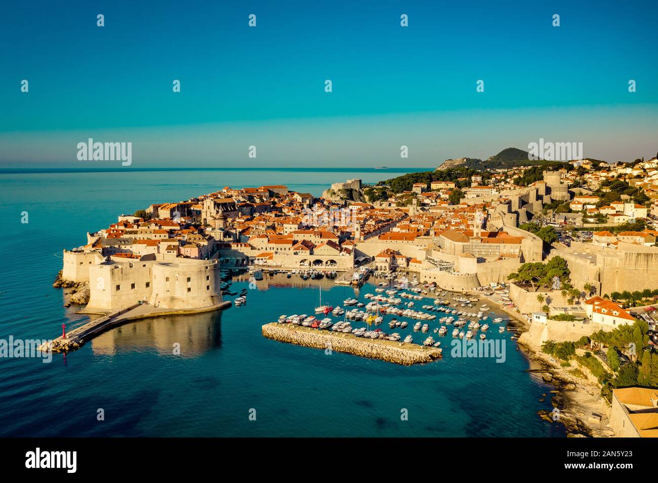 Vista Aerea De Drone Sobre La Costa Croata Que Revela El Casco Antiguo De Dubrovnik Y Las Murallas De La Ciudad Ciudad Vieja Europea Y Mar Adriatico Playa De Banje En Dubrovnik Da Fotografia