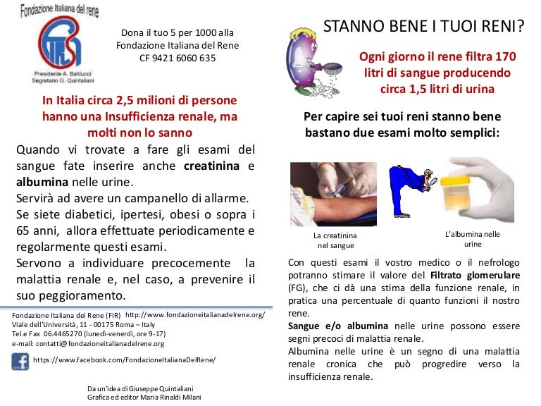 I reni sono organi importantissimi per la nostra sopravvivenza in quanto sono. Per Utente CARDIOPATICO, NEFROPATICO, ONCOLOGICO il valore di creatininemia deve essere al massimo di 1 settimana. Di Vicenza ed è gestito dal Legale Rappresentante Ing.