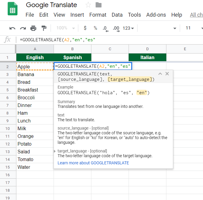 Google Sheets supports the same language codes as Google Translate If the language option exists in Google Translate, you can use it in your Google spreadsheet To see all the available languages, you should look at the list of languages supported by Google Translate Here you can learn the codes for all supported languages. Translate your text for free Over 30 languages available, including English, French, Spanish, German, Italian, Portuguese, Chinese and Hindi. Italian English Translator (Traduttore italiano) is free Best free traslator Why we Created This App??.