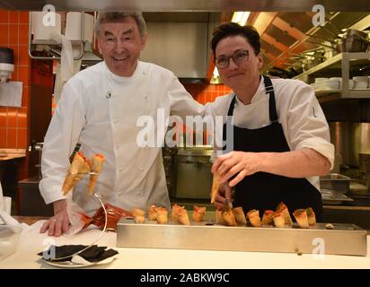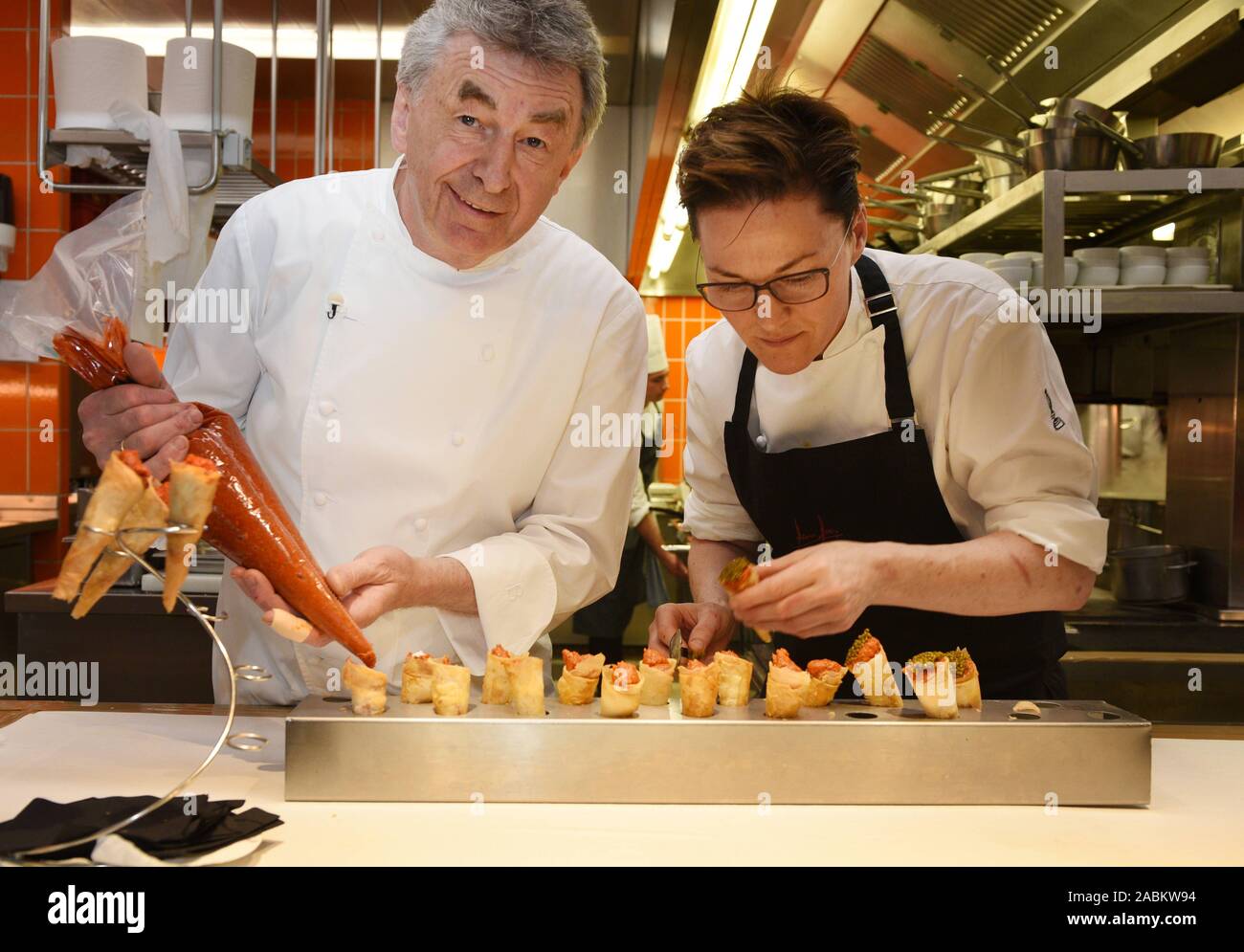 Star Chef Hans Haas L Con Sous Chef Sigi Schelling Nella Cucina Del Ristorante Gourmet Tantris In Johann Fichte Strasse 7 A Schwabing Traduzione Automatizzata Foto Stock Alamy