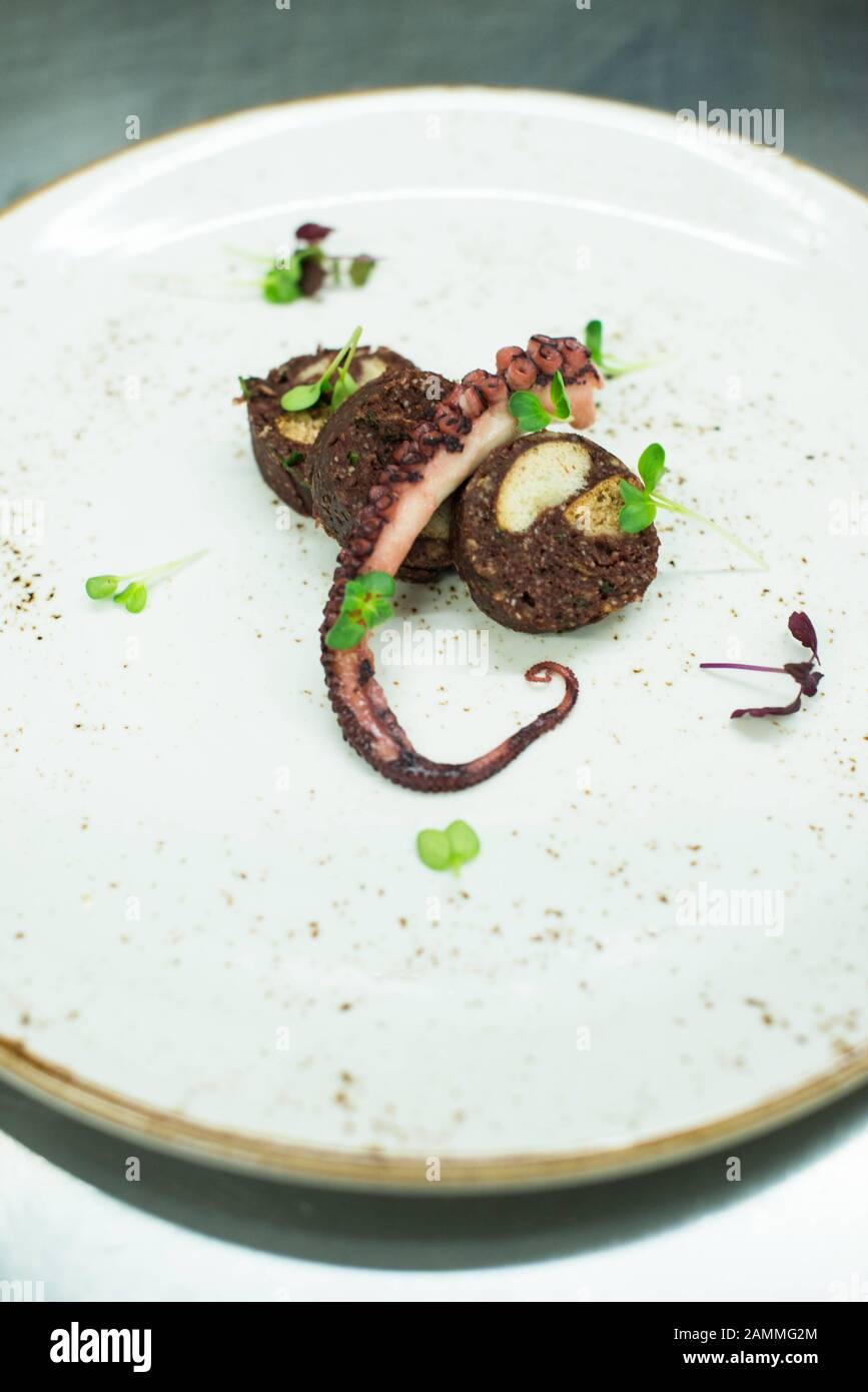 Lo Chef Vincent Fricke Prepara I Sanguinosi Gnocchi Di Tovagliolo In Questo Processo I Cubetti Di Pane Imbevuti Di Latte Speziato Vengono Conditi Con Sangue Di Maiale Traduzione Automatizzata Foto Stock