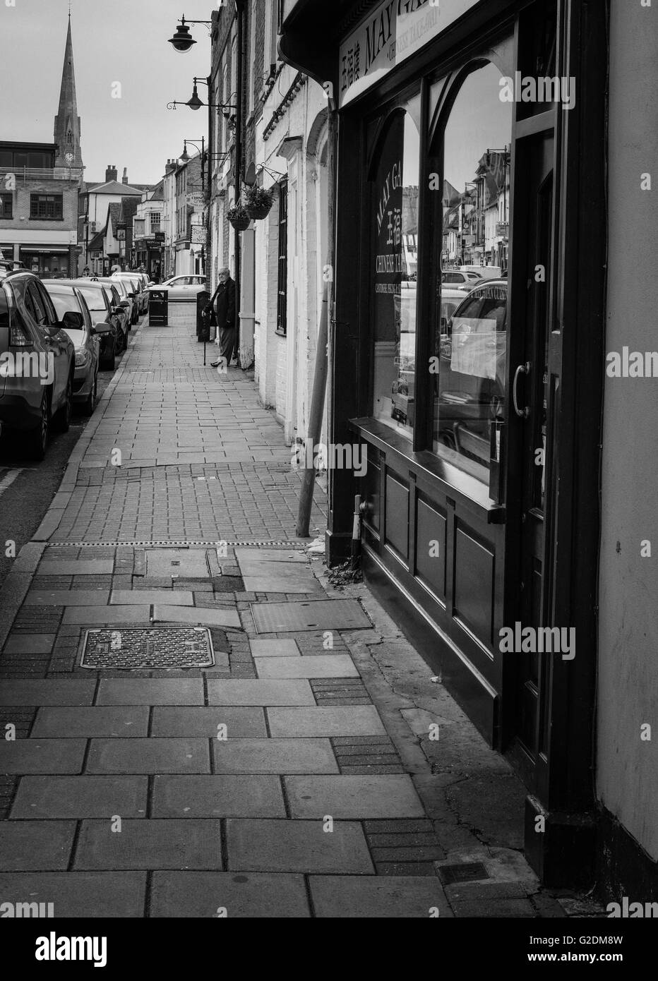 Vista Astratta In B W Di Un Marciapiede Sezione In Una Vecchia Cittadina Inglese Con Un Senior Persona Che Guarda Foto Stock Alamy