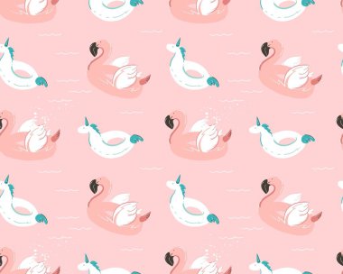 Premium Vector Hand Drawn Abstract Summer Time Fun Seamless Pattern With Pink Flamingo Float And Unicorn Swimming Pool Buoy Circle On White Background