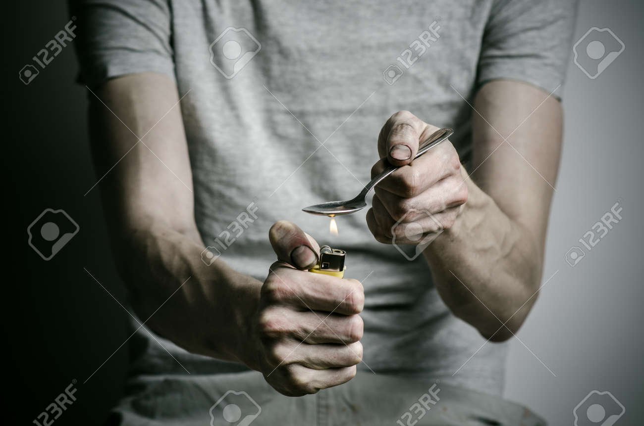 El Tema De La Lucha Contra Las Drogas Y La Drogadiccion Adicto A La Cuchara Encendedor Y Calienta La Droga Liquida En Una Camiseta Sobre Un Fondo Oscuro En El Estudio Fotos
