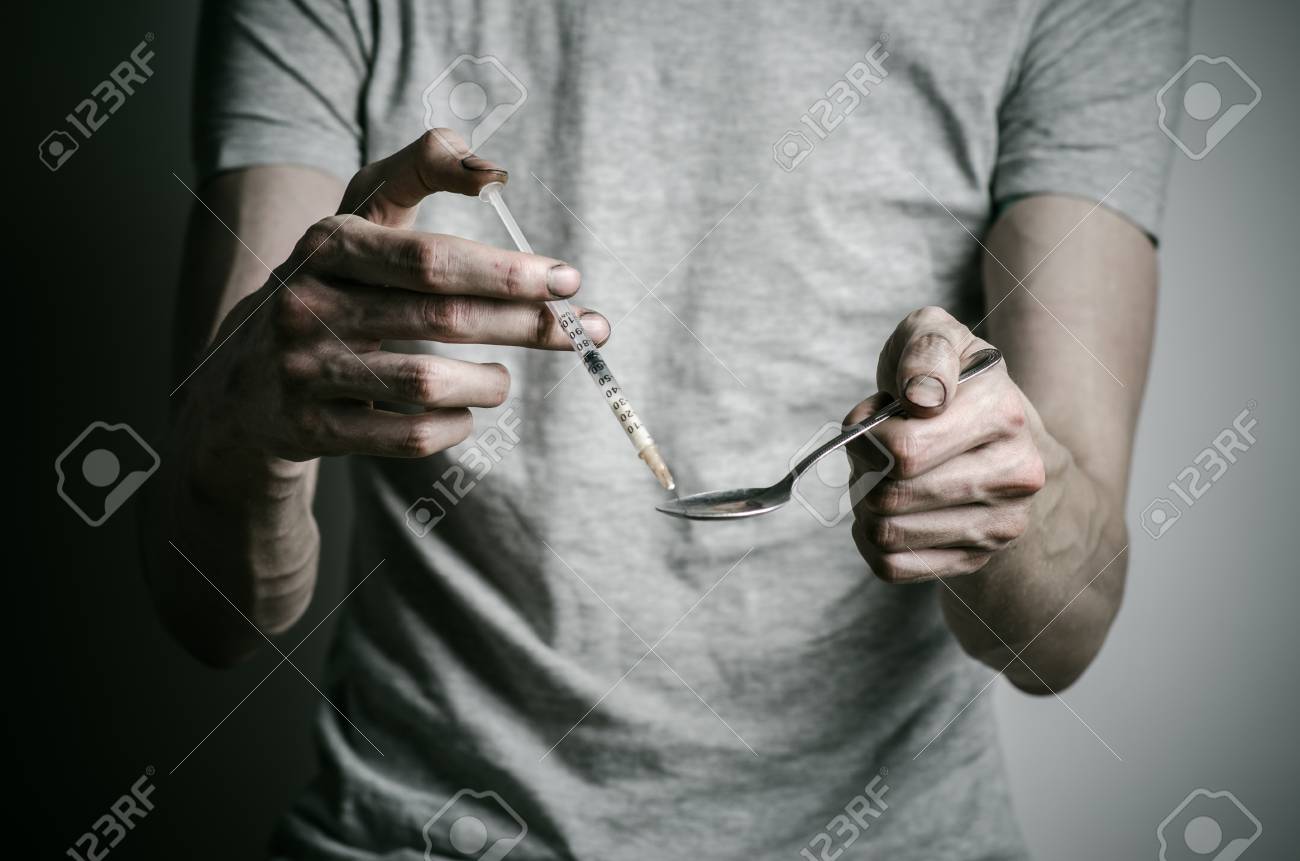 La Lucha Contra Las Drogas Y Tema De La Drogadiccion Adicto Sucio Flaco Que Lleva A Cabo Una Jeringuilla Con Una Droga Y El Cora Imagen De Archivo Imagen De Droga